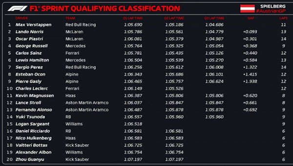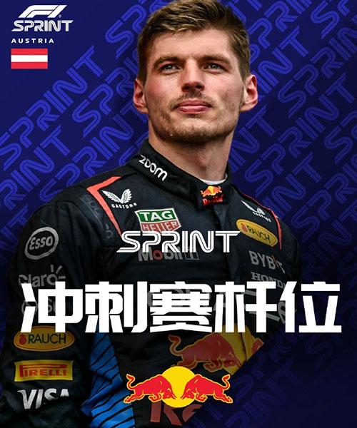 24直播网讯 北京时间6月28日,F1奥地利大奖赛结束冲刺排位赛争夺,红牛车队车手维斯塔潘以0.093秒的优势战胜诺里斯,夺得杆位。两人将在明天的冲刺赛中头排发车,皮亚斯特里排名第三。
