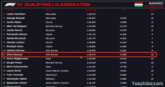 周冠宇确实很接近Q3,他此前只有过一次进入到Q3,这次来到匈牙利之后,周冠宇距离第10的博塔斯仅有0.121秒的差距,可以说,周冠宇又差点压过队友晋级Q3,状态确实调整的很好。