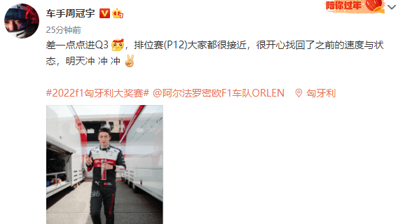排位赛之后,周冠宇也非常兴奋,他直接在社交媒体上放豪言,直言找回了之前的速度与状态,周冠宇表示:“差一点点进Q3,排位赛(P12)大家都很接近,很开心找回了之前的速度与状态,明天冲 冲 冲”