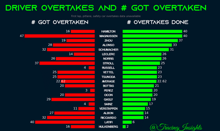 在被超车的榜单上,周冠宇只有19次,位居第14名。从这数据就可以看出,周冠宇在比赛中超车能力很强,同时他被超越的次数也不算多,这其实也是对于周冠宇的一种肯定。