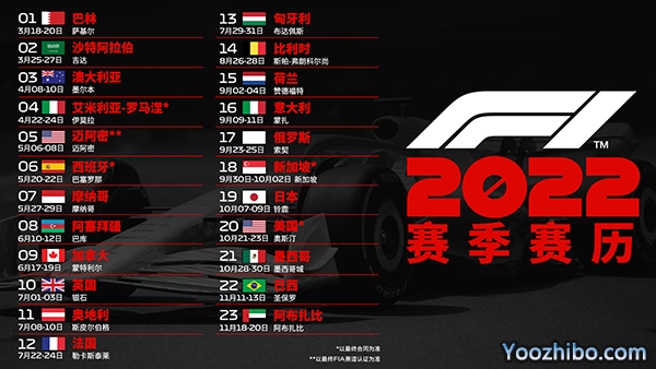 2022赛季共23场大奖赛,其中揭幕战巴林大奖赛 将於3月18-20日举行,最后一场阿布扎比大奖赛将於11月18-20日举行。