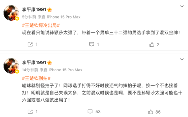 对此知名媒体人李平康却并不认可这样的说法:“输球就别怪拍子了!网球选手打得不好时候还气的摔拍子呢,换一个不也接着打!明明就是自己失误太多,之前混双时候也是啊,要不是孙颖莎太强,可能也16强或者8强就出局了!只能说孙颖莎太强了,带着一个男单32强选手拿到混双金牌!”