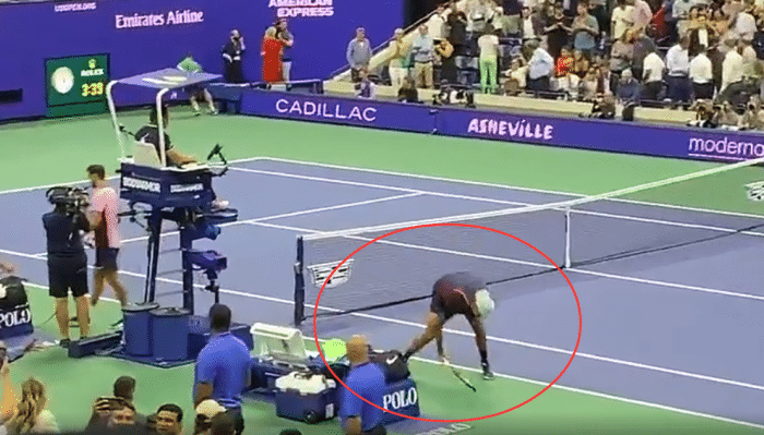 全场比赛结束后,卡恰诺夫正在向全场观众感谢示意,但是一边的克耶高斯已经情绪失控,他愤怒地摔自己的球拍,一个不过瘾,把另一支球拍又狠狠的摔在了地上,球拍已经完全被摔变形了,现场的球迷对于克耶高斯这样的举动十分不满意,观众们更是嘘声一片,克耶高斯脾气太爆了,这样的行为将会引来罚单。