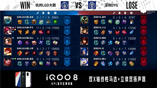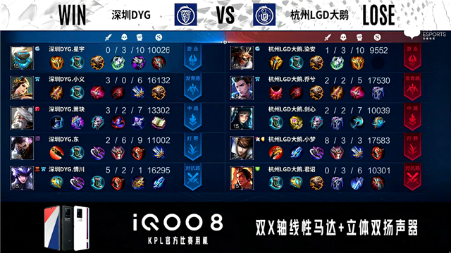 双方常规开局。1分01秒杭州LGD大鹅发育路击杀牛魔拿到一血。2分24秒深圳DYG拿下暴君。3分24秒深圳DYG中路击杀露娜。3分32秒杭州LGD大鹅摧毁敌方发育路外塔。3分42秒中路下河道团战深圳DYG打出0换2。4分52秒深圳DYG拿下主宰。5分21秒双方中路1换1。6分31秒深圳DYG对抗路击杀东皇太一。7分56秒双方发育路1换1,深圳DYG摧毁敌方发育路二塔。8分23秒杭州LGD大鹅摧毁敌方中路外塔。9分30秒中路团战深圳DYG打出0换2。12分07秒深圳DYG拿下暗影主宰。13分38秒深圳DYG发育路击杀露娜。14分06秒深圳DYG摧毁敌方中路二塔。14分41秒深圳DYG拿下暗影暴君。16分21秒对抗路团战杭州LGD大鹅打出0换2。18分12秒深圳DYG野区击杀廉颇。18分59秒深圳DYG拿下暗影暴君。20分46秒野区团战深圳DYG打出2换4。21分38秒深圳DYG摧毁水晶拿下比赛。