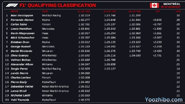 汉密尔顿第四。马格努森和米克·舒马赫分列五六位,哈斯车队占据发车第三排。第七至第九分别是:奥康、拉塞尔和里卡多,中国车手周冠宇 F1生涯首次晋级Q3,最终排名第十。