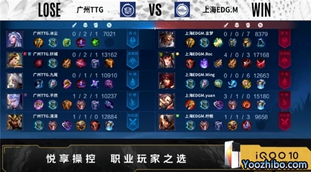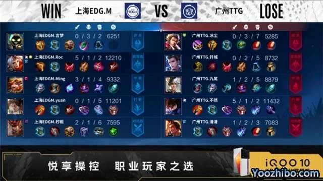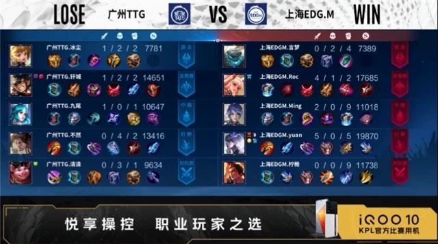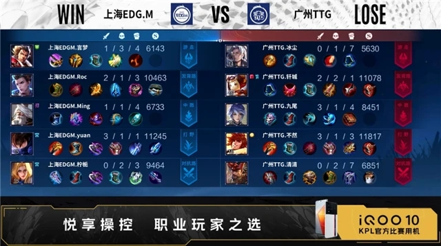 开局广州TTG射手换去对抗路。2分21秒广州TTG拿下暴君。5分48秒广州TTG摧毁敌方发育路外塔。6分44秒对抗路广州TTG击杀公孙离,拿下一血,上海EDG.M摧毁敌方对抗路外塔。7分06秒野区上海EDG.M击杀孙膑,镜三连决胜,打出1换3,拿下主宰。8分06秒中路广州TTG击杀盾山,拿下暴君。8分42秒广州TTG摧毁敌方对抗路外塔,上海EDG.M摧毁敌方发育路外塔。9分40秒中路上海EDG.M击杀猪八戒,打出0换4,摧毁敌方中路外塔、二塔,拿下暗影主宰。12分25秒上海EDG.M拿下暗影暴君。13分20秒上海EDG.M摧毁敌方对抗路二塔、发育路二塔,发育路击杀宫本武藏,拿下暗影主宰。16分19秒上海EDG.M拿下暗影暴君,17分51秒拿下暗影主宰。18分59秒上海EDG.M摧毁敌方发育路高地。21分37秒中路上海EDG.M击杀宫本武藏,打出0换2,摧毁敌方中路高地。22分16秒上海EDG.M击杀蒙犽,摧毁水晶拿下比赛。