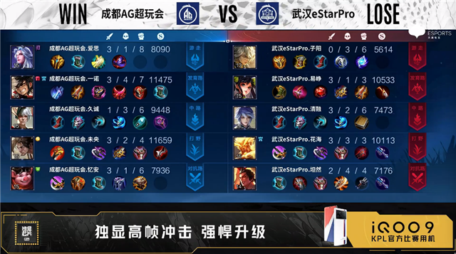 双方常规开局。2分49秒成都AG中路击杀不知火舞拿到一血。3分07秒成都AG拿下暴君。3分30秒武汉eStar拿下主宰,4分24秒主宰处双方1换1。5分19秒武汉eStar摧毁敌方对抗路外塔。5分48秒发育路团战武汉eStar打出1换2,5分55秒武汉eStar裴擒虎野区单杀橘右京。6分38秒成都AG中路击杀不知火舞。7分38秒武汉eStar拿下暴君。7分51秒武汉eStar野区击杀东皇太一。8分17秒武汉eStar摧毁敌方中路外塔。8分45秒成都AG野区击杀蒙恬。9分52秒双方野区1换1。10分08秒武汉eStar拿下暗影主宰。10分48秒武汉eStar拿下暗影暴君。11分17秒武汉eStar野区击杀项羽。11分47秒武汉eStar摧毁敌方发育路高地塔。12分30秒武汉eStar摧毁敌方对抗路二塔。13分03秒成都AG对抗路打出1换2。14分35秒武汉eStar拿下暗影暴君。15分47秒武汉eStar拿下暗影主宰。16分43秒武汉eStar摧毁敌方对抗路高地塔。17分17秒团战武汉eStar打出1换2并摧毁敌方中路高地塔。18分42秒武汉eStar中路打出0换4。18分44秒武汉eStar摧毁敌方水晶拿下比赛。