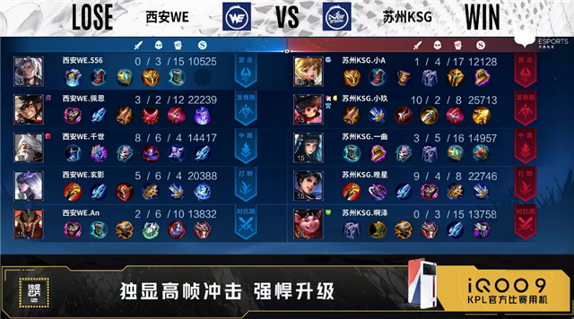 双方常规开局。1分04秒西安WE野区击杀太乙真人拿到一血。1分58秒苏州KSG中路击杀不知火舞。6分12秒苏州KSG野区击杀廉颇,西安WE摧毁敌方发育路二塔。7分15秒西安WE拿下主宰,苏州KSG拿下暴君。8分59秒西安WE摧毁敌方发育路二塔。9分40秒西安WE发育路击杀刘邦。9分55秒苏州KSG摧毁敌方中路外塔。10分40秒苏州KSG野区击杀虞姬并抢到暗影暴君。11分06秒苏州KSG摧毁敌方中路二塔。11分14秒发育路团战苏州KSG打出0换3。11分57秒苏州KSG拿下暗影主宰。13分20秒苏州KSG对抗路击杀廉颇。13分29秒苏州KSG摧毁敌方对抗路高地塔。15分48秒苏州KSG拿下暗影主宰。18分14秒苏州KSG拿下暗影暴君。18分35秒苏州KSG发育路击杀橘右京。19分05秒苏州KSG摧毁敌方水晶拿下比赛。
