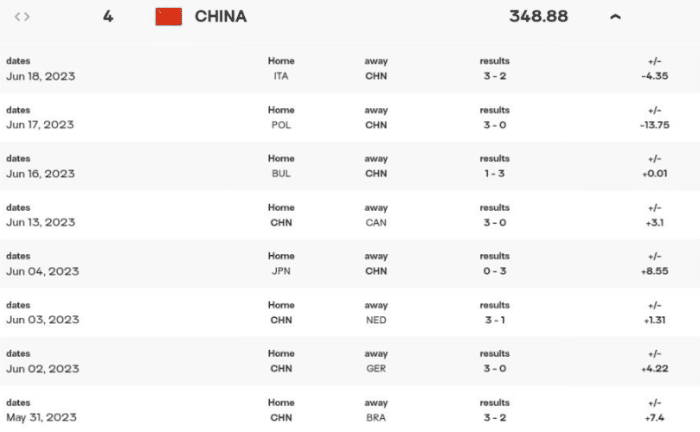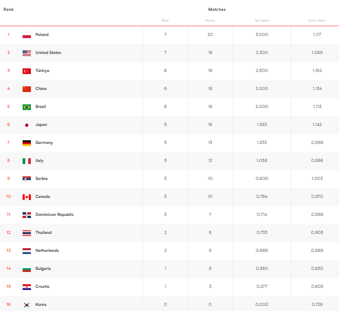 波兰队本周虽然不敌荷兰女排,全胜的金身被打破,但她们击败了主要竞争对手中国女排,目前战绩7胜1负,排名第一。美国女排位居第二,她们也是第一周全胜,第二周输了球,不过最后一场比赛3-0横扫巴西队,一扫颓势。美国女排战绩与波兰队一致,小分劣势位居次席。