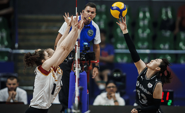 韩国队排名垫底,此前的7场比赛,韩国女排全败,第二周的最后一站面对德国队,虽然难逃8连败的命运,但终于1-3赢了一局,非常不容易,拿到了本届世联赛的第一局胜利。