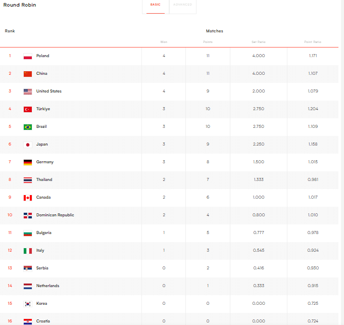 波兰女排位居第一,在前4场比赛她们全部取得胜利,首战以3-2险胜加拿大,第二场3-1击败意大利,之后面对泰国和塞尔维亚,波兰女排全部拿下胜利,都是3-0横扫,所以在小分对比上,4连胜的波兰队排名第一。