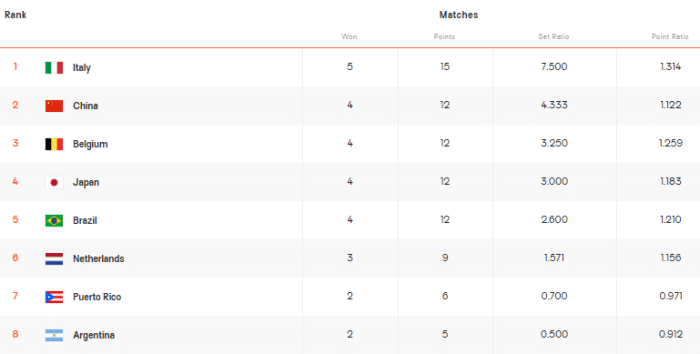 第二阶段开始之前,各队有短暂的休息和调整的时间,在第二阶段比赛之前,我们一起来看看中国队所在的小组排名情况:8支球队,意大利5战全胜位居第一,4胜1负的球队有多达4支,中国女排位居第二名。荷兰队3胜2负、波多黎各和比利时都是2胜3负。