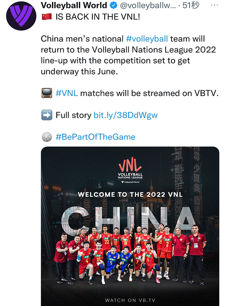 来源:24直播网04-30 10:4824直播网04月30日讯 晚上,中国男排传来重大利好消息,国际排联发文确认:中国男排重返2022年世界男排联赛,开赛时间是今年6月份。这样中国男排正式取代俄罗斯队,出战接下来的世界男排联赛,这对于中国男排来说是非常好的事情。