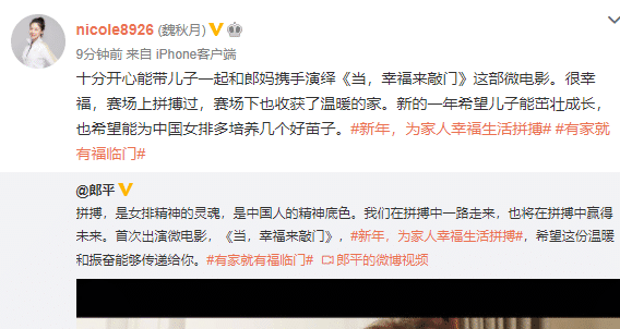 魏秋月也在社交媒体上表示:“十分开心能带儿子一起和郎妈携手演绎《当,幸福来敲门》这部微电影。很幸福,赛场上拼搏过,赛场下也收获了温暖的家。新的一年希望儿子能茁壮成长,也希望能为中国女排多培养几个好苗子。”
