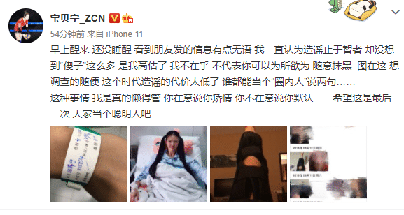 张常宁在社交媒体上晒出了自己2018年治疗伤病和住院的照片,配文:“早上醒来 还没睡醒 看到朋友发的信息有点无语 我一直认为造谣止于智者 却没想到“傻子”这么多 是我高估了 我不在乎 不代表你可以为所欲为 随意抹黑 图在这 想调查的随便 这个时代造谣的代价太低了 谁都能当个“圈内人”说两句……这种事情 我是真的懒得管 你在意说你矫情 你不在意说你默认……希望这是最后一次 大家当个聪明人吧”