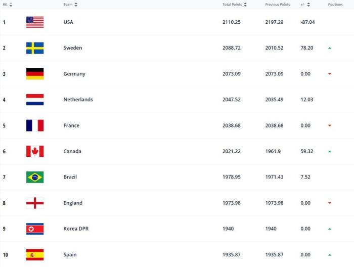 24直播网讯 今日,FIFA最新一期排名更新,中国女排排在世界第17名,亚洲第4名。可能是受奥运会战绩影响,与此前6月25日发表的世界排名相比,中国女足下降2位。