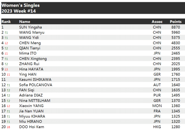 来源:24直播网04-04 10:2324直播网04月04日讯 国际乒联公布了2023年第14周的排名,因为此前奥运积分清零的原因,所以排名有很大的变化,比如男单的马龙从第二下滑到第四,王楚钦和张本智和的排名提升。女单的变化也非常大,王曼昱升至第二,王艺迪升至第三,钱天一升至第五,排名下滑的是陈梦,她从上一期的第二名来到本周之后排名跌至第四。