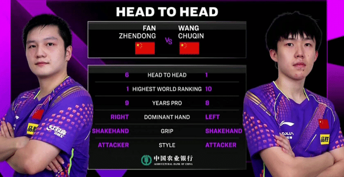 赛前:樊振东世界排名第1,王楚钦位居第11名,此前双方在国际大赛有功7次交手记录,樊振东6胜1负占据优势。