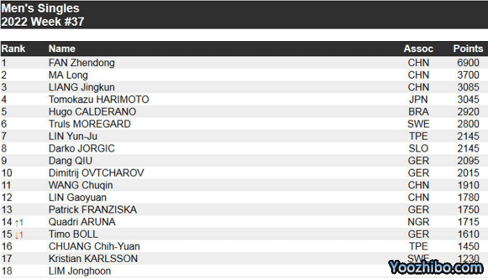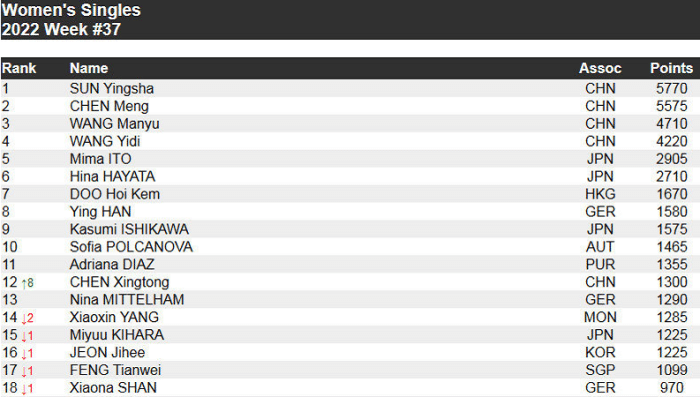 来源:24直播网09-13 10:2324直播网09月13日,国际乒联第37周世界排名更新,本周变动不小。在罗马尼亚和阿曼连续夺冠,同时拿下世锦赛参赛资格的陈幸同成为最大赢家,她从上周的第20名来到女单世界第12名。亚军崔孝珠排名上升39位,排名女单第52名。在阿曼斩获男单亚军的梁俨苧排名暴涨449位,来到了第68位。尼日利亚选手阿鲁纳非锦赛夺冠,反超波尔,升至男单第14名。