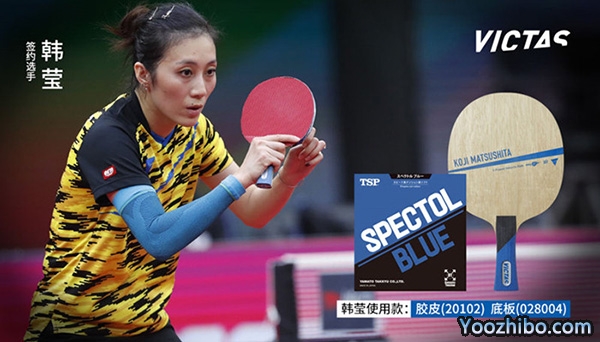 韩莹的乒乓球拍底板是VICTAS松下浩二,反手是TSP SPECTOL BLUE生胶,韩莹就是用这么一款独特的削球流配置打出了自己的名气。