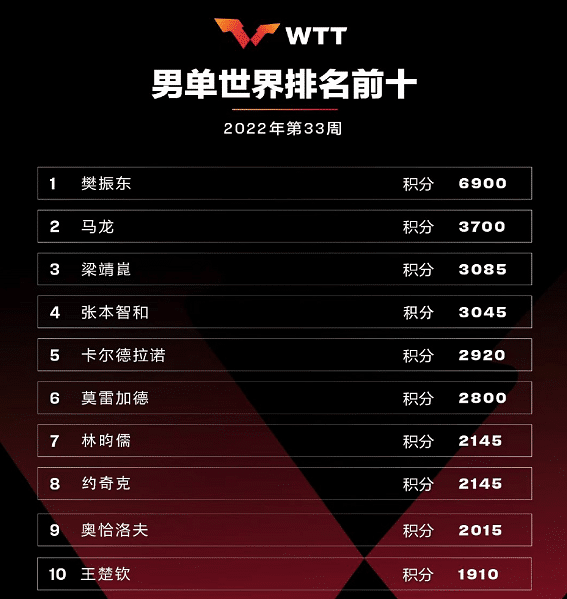 马龙继续处于男单第二名,这名双圈大满贯得主落后樊振东3200分。第三名属于梁靖崑,第四名属于张本智和,值得一提的是,梁靖崑仅仅领先张本智和40分,双方之间的差距微乎其微。其他的国乒成员,王楚钦位居男单第10名。林高远排名第11,向鹏排名第29,袁励岑排名第34名。