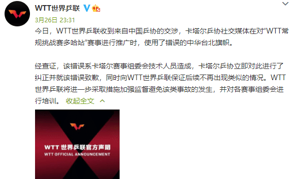 这是在今年3月份的WTT常规挑战赛多哈站,赛事在使用国旗的时候犯了错误,当时就令无数球迷不满,怒斥WTT世界乒联。很快官方就发布了道歉声明,内容是:“经查证,该错误系卡塔尔赛事组委会技术人员造成,卡塔尔乒协立即对此进行了纠正并就该错误致歉,同时向WTT世界乒联保证后续不再出现类似的情况。WTT世界乒联将进一步采取措施加强监督避免该类事故的发生,并对各赛事组委会进行培训”