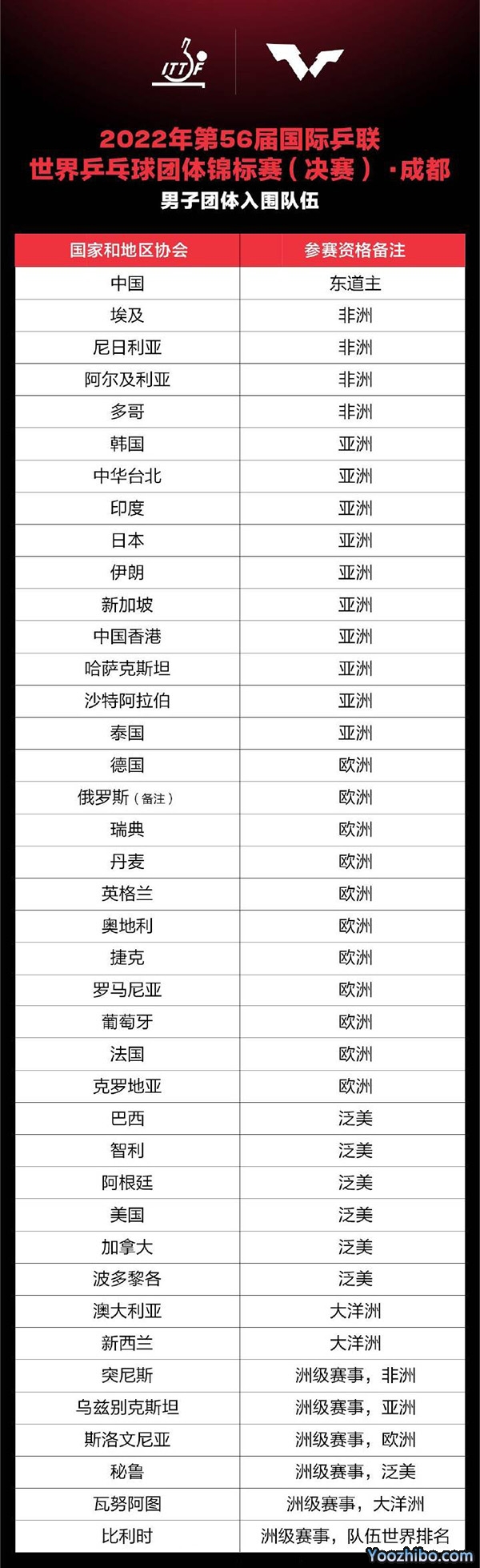 2022年第56届国际乒联世界乒乓球团体锦标赛(决赛)· 成都站,将于9月30日至10月9日在中国成都举行,参赛队伍名单已全部揭晓。