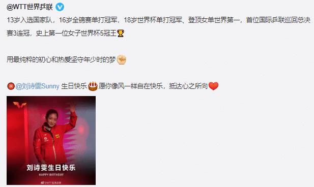 国际排联在今天0:00卡点送上祝福,称“13岁入选国家队,16岁全锦赛单打冠军,18岁世界杯单打冠军、登顶女单世界第一,首位国际乒联巡回总决赛3连冠,史上第一位女子世界杯5冠王。用最纯粹的初心和热爱坚守年少时的梦,祝刘诗雯生日快乐,愿你像风一样自在快乐,抵达心之所向”