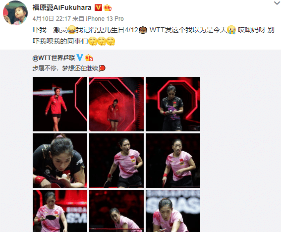刘诗雯生日,她的好友、闺蜜福原爱堪称时刻名记,此前WTT发布了几张刘诗雯的照片,同时配文“步履不停,梦想还在继续”。福原爱因此被吓一跳,她表示自己明明记得刘诗雯的生日是4月12日,吓得自己一激灵。