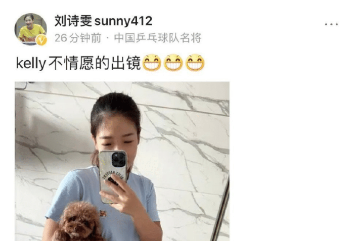 刘诗雯表示,“kelly不情愿的出镜”。kelly是刘诗雯的宠物狗名字,刘诗雯抱着小狗狗自拍,可以看出,刘诗雯非常宠爱她的小狗狗,将它当作是自己的朋友。