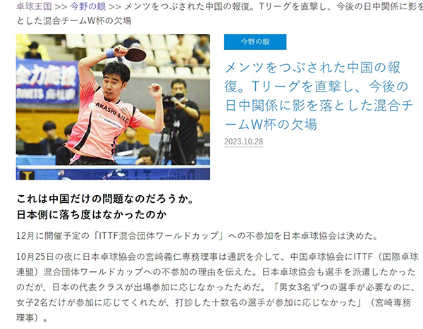 日本乒乓球专业媒体《卓球王国》写道:“这难道只是中国的问题吗?日本方面没有过错吗?”