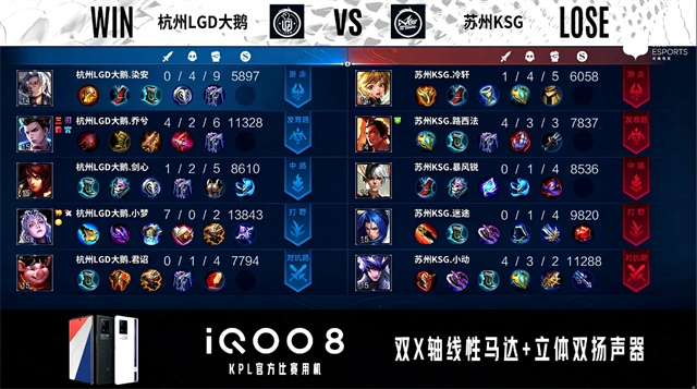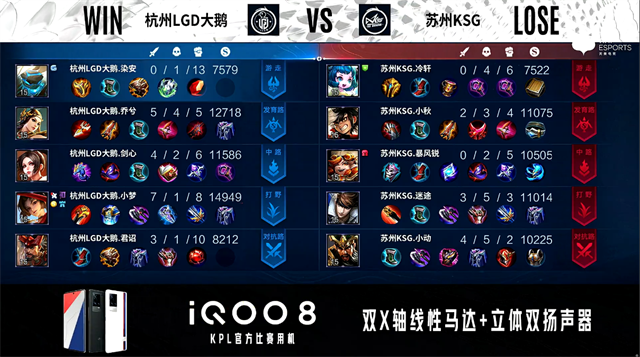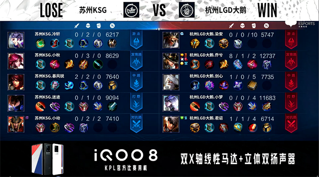 双方常规开局。1分05秒杭州LGD大鹅中路打出0换2。1分21秒杭州LGD大鹅对抗路打出0换2。2分15秒杭州LGD大鹅拿下暴君。5分25秒暴君处团战苏州KSG打出0换2,杭州LGD大鹅摧毁敌方对抗路外、二塔。6分31秒野区团战杭州LGD大鹅打出0换4。7分44秒杭州LGD打色发育路击杀蔡文姬。8分02秒苏州KSG发育路击杀虞姬。9分01秒双方中路射手互换。10分03秒杭州LGD大鹅对抗路打出1换2。11分04秒杭州LGD大鹅拿下暗影暴君。12分24秒杭州LGD大鹅发育路抓死关羽。13分08秒杭州LGD大鹅不知火舞野区单杀赵云。13分31秒杭州LGD大鹅拿下暗影主宰。15分15秒苏州KSG野区打出0换2。11分48秒苏州KSG拿下暗影暴君。17分07秒野区团战杭州LGD大鹅打出2换3。17分38秒杭州LGD大鹅团灭对手。17分49秒杭州LGD大鹅摧毁敌方水晶拿下比赛。