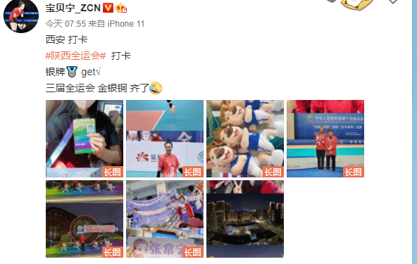 赛后第二天,张常宁在社交媒体上晒出了组图,这是她来到西安参赛的回忆,同时配文称:西安打卡 陕西全运会打卡 银牌 get 三届全运会 金银铜 齐了