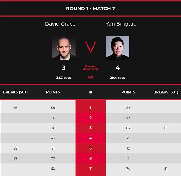 - 【录像】[优酷] 2020斯诺克世界大奖赛 第1轮 大卫-格雷斯VS颜丙涛 全场录像2020-12-17 01:01:00