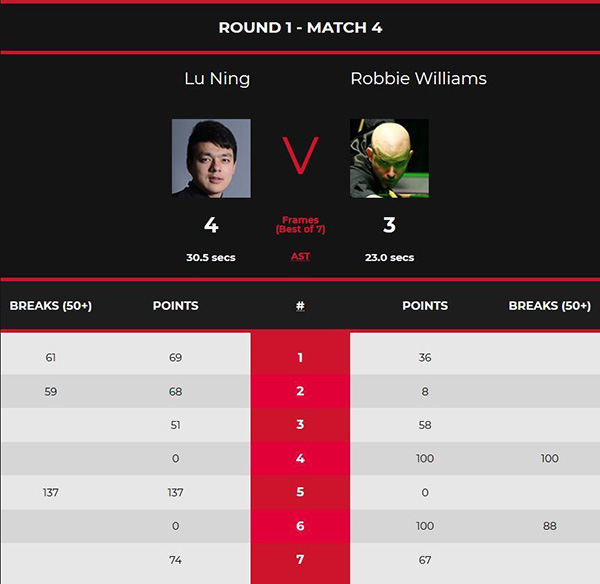 这场比赛,前两局,鲁宁先后轰出单杆61分和59分,以69-36和68-8胜出,总比分2-0领先。但随后罗比-威廉姆斯开始爆发,以58-51拿下艰难的第三场比赛,将比分追成1-2,第四局,罗比-威廉姆斯又是单杆100分获胜,将比分追成2-2平。