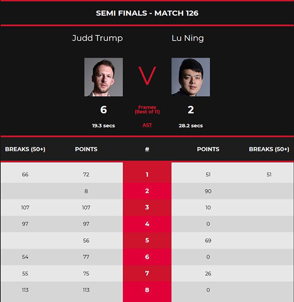 第六局,特鲁姆普先拿13分做防守,鲁宁两次解球碰到蓝球被罚10分。特鲁姆普上手单杆54分后,以77-0再胜一局4-2领先。第七局双方防守纠缠各送失误,特鲁姆普打出一杆55分,以75-26再胜一局,5-2拿到赛点。第八局,特鲁姆普拼进底袋红球上手,一杆破百得到113分,零封再下一城6-2晋级决赛。