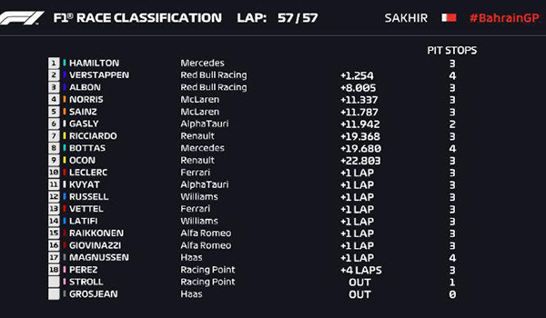 由于赛道的清理花费时间较多,最终,比赛的最后3圈在安全车的引领下跑完,汉密尔顿夺得分站冠军,维斯塔潘获得亚军、由于佩雷兹退赛,红牛车队的阿尔本幸运的登上领奖台,以第3名的成绩完赛,诺里斯、赛恩斯、加斯利分别排在4-6位。