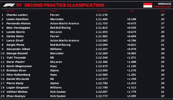 24直播网讯 北京时间5月25日,F1摩纳哥站二练结束,勒克莱尔全场最快,汉密尔顿、阿隆索二三带回,索伯双车位居19,20。