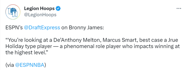 单论ESPN的全美排名,布朗尼在其中并不算抢眼。受邀请的24位球员里,他的全美排名(第28位)是倒数第2,只有同在西部明星队的布兰登-加里森(第30位)比他更低。全美排名第1的贾斯汀-爱德华兹、第2的DJ-瓦格纳以及第4的布拉德肖都在东部明星队。布朗尼要想在这里面出风头,难度还是不小的,但他是詹姆斯的儿子,这就是绝对的流量。