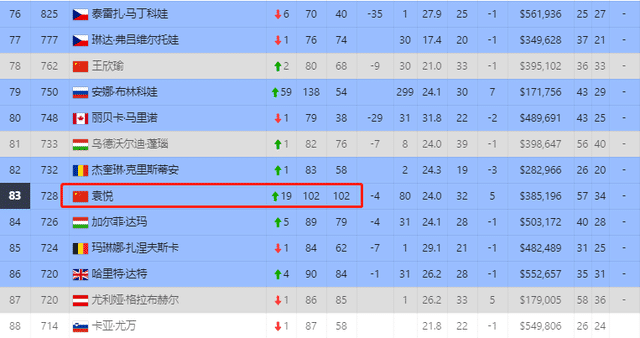 本站赛事夺冠之后,袁悦的即时排名来到世界第83位,大幅提升了19位。由于明年澳网的报名截止日前赛事不多,袁悦几乎锁定了世界前96位,从而锁定一个正赛名额。对于此前数次被阻挡在正赛门外的袁悦来说,这次她可以如愿首次参加澳网了。