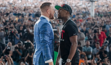 第一次交手,嘴炮在开场狂风暴雨一般的进攻点燃了所有人,但梅威瑟本身就擅长防守,再加上拳击的手套好UFC的手套是不同的,所以其实嘴炮很多都是无效击打。当梅威瑟开始发力之后,虽然年龄更大,但更懂得规则、合理运用体能的他在第10回合就KO了嘴炮,表现强势。