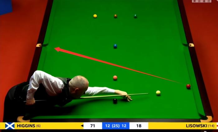 这场比赛,希金斯的支持率明显低于利索夫斯基,但在压力之下,希金斯迸发了能量。在对手失误之后,希金斯上手,面对比较复杂的球形,希金斯打出了自己控球的火候。在单杆拿下71分之后,希金斯已经71-18领先53分,而此时台面上只剩下2颗红球,最高分只有43分。