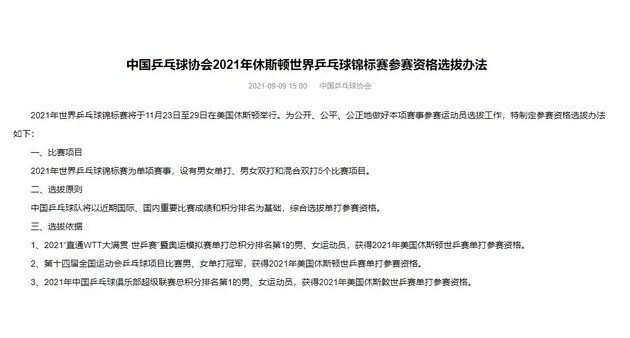 来源:24直播网09-09 19:4924直播网9月09日讯 下午,中国乒乓球协会公布了世乒赛的参赛资格选拔办法,奥运会之后,国际大赛最重要的就是世乒赛了,在9月份的全运会结束之后是10月份的乒超联赛,世乒赛则是在11月23日至29日在美国休斯顿举行,如今参赛运动员选拔规则已经出炉。