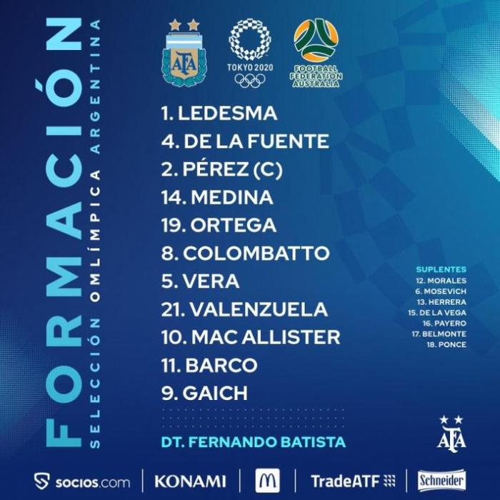 阿根廷首发:1-莱德斯马、2-内乌恩-佩雷斯、4-德拉富恩特、14-梅迪纳、5-福斯托-维拉、8-科伦巴托、10-麦卡利斯特、11-巴尔科、19-奥尔特加、9-盖奇、21-巴伦祖埃拉