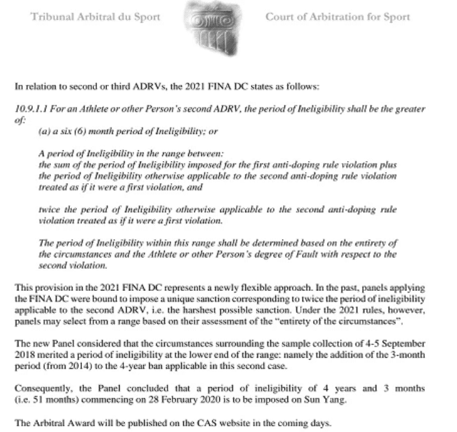 孙杨的禁赛期被缩短的原因并非他请到新的律师团队翻盘,而是灵活运用了2021年开始执行的国际泳联新规。孙杨第一次违规是2014年,当时被禁赛3个月,2018年是第二次,违规后被禁赛4年,因为是第二次,所以此前的规定是翻倍,第一次的判决是8年。而因为国际泳联新规中对于“拒检”的错误程度更加灵活性,所以不再是直接翻倍,而是争取到了第二次违规的4年再加上第一次违规的3个月,等于正好是51个月新的禁赛期。