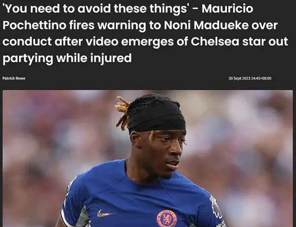 来源:24直播网10-01 12:1424直播网10月01日讯 莫里西奥-波切蒂诺向切尔西边锋诺尼-马杜埃克发出警告,有视频显示他在受伤的情况下仍参加派对。