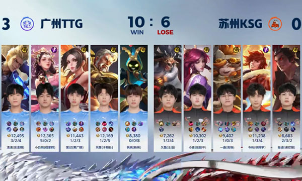 十一分左右,广州TTG丶帆帆 (杨帆) 张飞大招先手开团逼退对方几人后,破除对方中路一塔,并击杀对方太乙真人。随后,苏州KSG轻语 (谢欣臻)姬小满绕后击杀对方张飞,双方一换一。十三分三十左右,红区一波团战,广州TTG主动追击击杀对方四人,并顺着上路兵线击破水晶,拿到本局比赛的胜利!