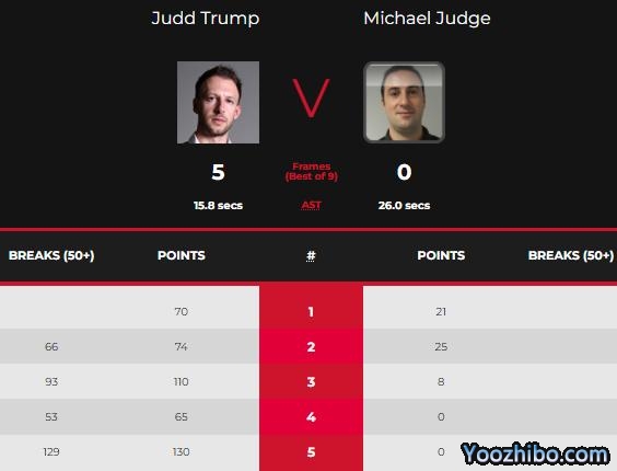 第五局,特鲁姆普开局率先上手得分,1-0后断掉,没有退路的贾奇赛事没有能够得分,特鲁姆普再次上手轰出单杆129分,130-0再次零封贾奇,总比分5-0强势晋级第二轮。