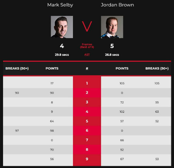 下半场第五局,塞尔比在被超两杆斯诺克的情况下,顽强地清台追平,并成功翻进黑球以64-57艰难追上一局。第六局塞尔比长台打进,此后再上手一杆制胜,攻下97分以98-0再下一城追至3-3。第七局布朗先取28分,将母球贴在咖啡球后,此后再上手攻下38分以66-0取胜,4-3获得赛点。第八局塞尔比在彩球较量中取得主动,以70-52获胜追上赛点。决胜局布朗单杆拿下53分,塞尔比展现出绝佳的做安全球的能力,经历被超分反做成功,再被超分又成功反做的过程,没想到却打丢最后的制胜黑球,布朗清台以67-56获胜,继续爆冷以5-4淘汰塞尔比,职业生涯首次打进排名赛四强。