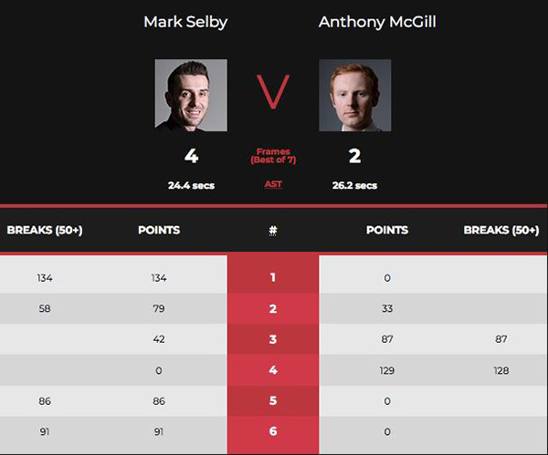首局单杆134分清台取得开门红,紧接着单杆58分以2比0领先。第三局开始麦克吉尔单杆87分和128分连扳两局,大有逆转之势。随后塞尔比掌控局面,单杆86分和91分连续两局零封对手最终以4比2晋级8强。